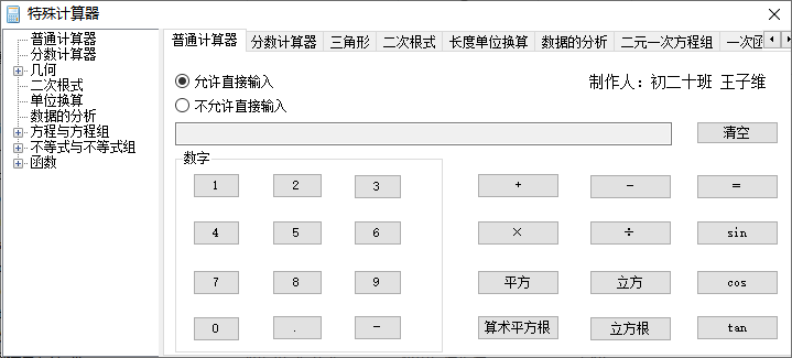 特殊计算器是一款多合一的计算器工具,它包含了各种函数,分数和常数的计算功能,可满足用户对不同算式的计算需求;该工具与我们常用的计算器不同,一般我们使用的计算器只能用来计算简单的算式,尽管也支持计算方程,但也必须按照方程的步骤来进行计算,无法一步到位;而这款特殊计算器采用了一种直观的计算方式,提供计算模板,用户只需要填充对应数值就可以一键获取计算结果,它支持常数,分数,一元二次方程,二元一次方程,三角函数等等算式的计算;需要的朋友赶紧下载吧。