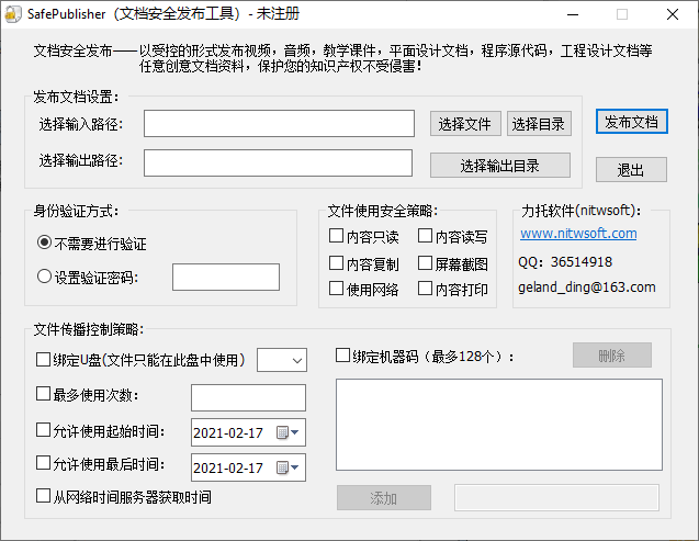 SafePublisher是一款文件加密工具,可以通过该软件为各类文件设置密码,添加访问权限,还可以绑定机器码;文件安全一直是原创作者很重视的问题,没有任何作者希望自己付出汗水制作的文件轻松被其他人拷贝使用,因此在发布文件之前,为文件添加一个保护密码是必要的工作;SafePublisher能够为用户提供一个全面的文件加密解决方案,用户可以灵活的使用它为文件添加各种访问限制,比如防截屏,防复制和限制访问时间等;这款工具简单实用,用来保护原创视频,音乐,代码或者各种设计原图等都是很好的,需要的朋友欢迎下载。