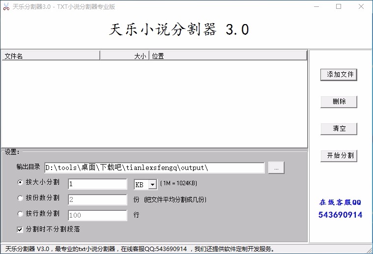 天乐小说分割器是一款非常简单且实用的TXT小说分割软件,顾名思义通过该软件可帮助用户快速将TXT小说文件进行分割,我们在网上阅读小说时可能会遇到自己喜欢的小说,将其下载后文件过大不方便进行阅读,这时候就可以用到这款软件,软件操作非常简单,只需添加TXT小说文件并选择分割方式以及设置好输出目录,一键即可进行分割,按照预设的分割方式将TXT小说分割为多个小的部分从而便于您在便携设备上阅读小说文件内容,使用起来非常方便,欢迎有需要的用户下载体验