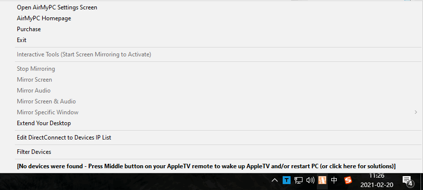 3、通过AirMyPC托盘图标将计算机屏幕镜像到Apple TV。