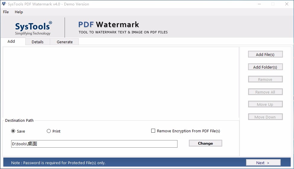 该软件可以在受限制的PDF文档中添加水印,并知道受密码保护的PDF文件。但是,如果密码被锁定为PDF,则用户在添加安全PDF时必须知道密码并输入。否则,请继续下一步。