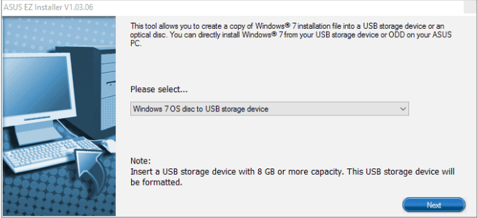 ASUS Easy Installer是一款镜像文件写入工具,它可以帮助用户将Windows 7的系统文件写入USB中,同时写入相关驱动程序以制作USB系统安装工具;安装系统的方式有三种,分别是通过网络安装,DVD安装和USB安装;其中在线安装需要电脑连接网络,而DVD和USB安装则需要用户提前将系统镜像文件和安装驱动写入到里面;ASUS Easy Installer是华硕推出的一个专业系统安装盘制作软件,它采用引导式的窗口设计,可以指引用户一步步的进行系统盘制作,非常简单;这款工具仅可以制作win7的系统安装盘,暂不支持其它版本的系统盘制作,需要的朋友欢迎下载。