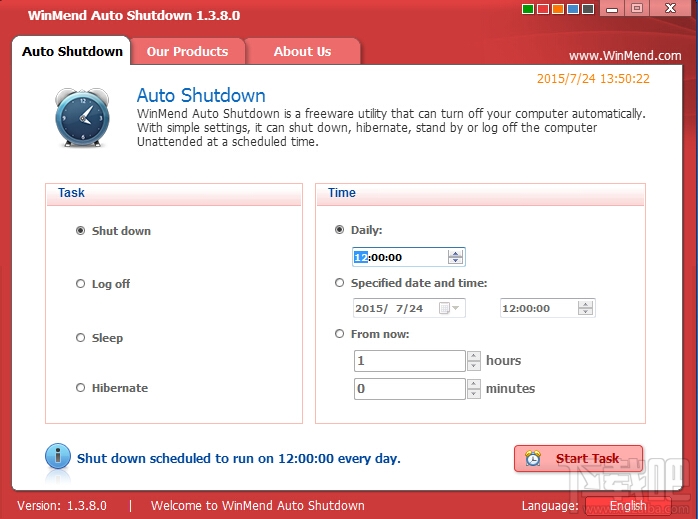 219 KB/2020-08-17下载吧提供的upwndtime支持定时关机、重启、闹钟,也支持超远程关机、重启、闹钟;upwnd系列软件均采用绿色编程不需安装即可执行。备注:1.软件运行目录下alarm.wav为闹钟声音文件,用户可自定义替换;2.关闭软件,请在托盘图标处右键退出。