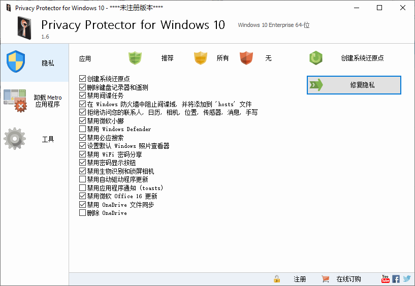 Privacy Protector for Windows 10是一款简单好用的win10系统配置工具,用于配置计算机系统以让系统的性能得到提升;在win10系统中,有很多功能对用户的工作并没有很多的帮助,并且部分功能还可能会影响用户工作;对于用处不大的功能我们可以直接禁用,这样不仅可以降低计算机的内存占用,还可以提升计算机的运行速度;Privacy Protector for Windows 10的使用方式很简单,它适用于任何用户,哪怕是刚使用计算机没多久的用户也可以能轻松通过它配置计算机;总之这款工具对于用户配置计算机系统是很实用的,需要的朋友赶紧下载吧。