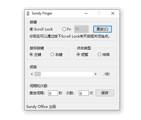 Sundy Finger是一款自动鼠标点击工具,用户可以使用这款工具完成一些需要连续点击的任务;这款工具可以应用在刷新网页,打印纸张和其它需要反复点击的场景中;很多用户在办公过程中会需要不断刷新网页,或是点击某个特定的功能按钮,比如打印按钮,提交按钮等;一般情况下这些都是通过手动完成的,但如果鼠标可以自动进行点击,那么肯定会提高用户的工作效率;Sundy Finger允许用户自定义鼠标的点击间隔和次数,支持左击和右击,可满足不同用户的使用需求,为用户节省时间,需要的小伙伴赶紧下载体验吧。