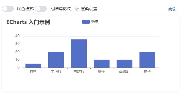 然后就可以通过 echarts.init 方法初始化一个 echarts 实例并通过 setOption 方法生成一个简单的柱状图,下面是完整代码。