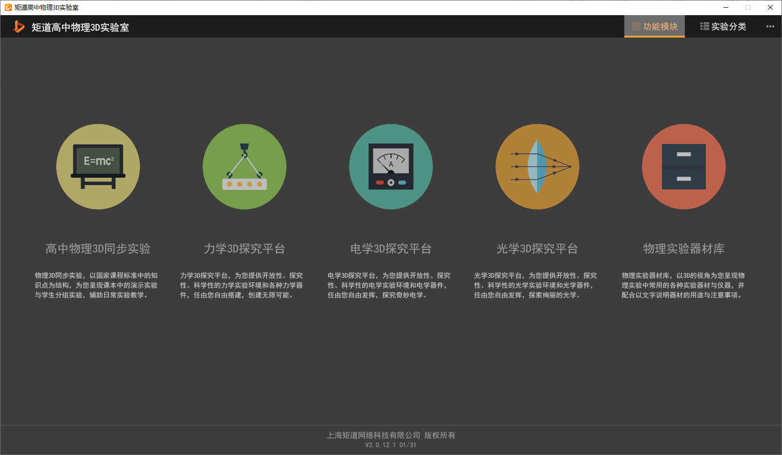矩道高中物理3D实验室是一款专为高中教学所推出的仿真3D物理实验软件,该软件具备高中阶段学习的所有实验,提供丰富的仿真实验工具,用户可以使用这些工具完成相关物理实验;这款软件分为五大模块,每一个模块所承担的功能不一样,比如在高中物理3D同步实验中,用户就可以快速进行在高中课程中所学的各种实验,而力学,电学,光学等实验平台则可以为用户提供更多的物理实验探究,这些实验或许是课程中没有的,属于扩展性的实验功能;还有一个物理实验器材库,对于实验所需的器材用户应该要了解,所以在该模块中,用户可以直观的查看各种实验器材的样式,名称和作用等信息。