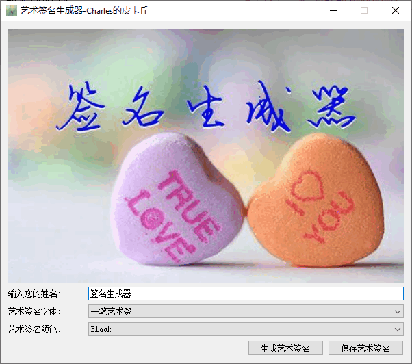 艺术签名生成器顾名思义是一款用于制作艺术签名的工具,该工具共支持五种艺术字体,用户可以使用它为自己生成不同的艺术签名;好看的签名可以给其他人留下好的印象,但很少有用户拥有自己的艺术签名,原因是自己需要使用签名的地方很少,再者就是用户自己没有设计能力或者找人设计签名的价格比较昂贵;现在用户通过这款艺术签名生成器,仅需一键就可以轻松为自己生成多种不同的艺术签名,用户可以将生成的签名保存到计算机中进行临摹使用;需要的朋友欢迎下载。