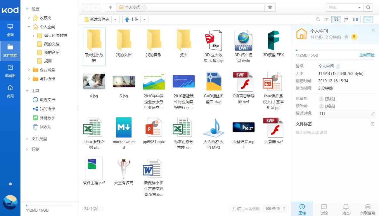 可道云服务器端是一款体积轻量、简单易用的云端服务器部署工具,完全支持私有化部署,云盘自主可控,可以帮助用户快速搭建属于自己的云服务器,通过该软件用户可以轻松搭建个人专属的私有云盘,可以轻松向客户以及公司内部员工分享文件或者对重要文档进行上传保存;可道云服务器端全平台覆盖,支持主流浏览器,上数百种文件格式在线预览、编辑和播放等多种功能,满足用户对文件存储、协作共享等多种需求,同时可为用户提供并文件实时增量同步、本地编辑、文件上传下载等特色功能,可以说是一款功能非常丰富且专业实用的网络共享软件。