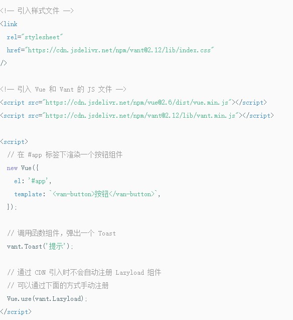 使用 Vant 最简单的方法是直接在 html 文件中引入 CDN 链接,之后你可以通过全局变量 vant 访问到所有组件。