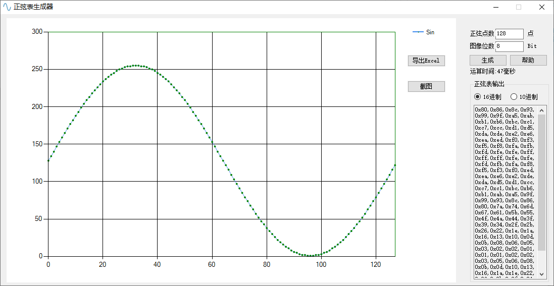 5、下方是计算得到的正弦数据,可以在此切换数据的进制类型。