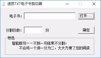 速思txt电子书剪切器是一款非常简单且实用的txt电子书剪切软件,使用该软件可帮助用户快速将TXT电子书文件进行剪切,实际上就是将电子书进行分割,有的时候我们在网上下载了一些大型的TXT电子书,为了方便阅读和使用,可将该电子书分割为多个小的部分,从而能够更好的进行阅览,软件功能专一,专门用于分割TXT电子书,无任何花里胡哨的功能,只需添加电子书文件并设置分割份数,一键即可进行分割,值得一提的是软件提供了智能断句功能,这么好用的软件赶快下载试试吧!