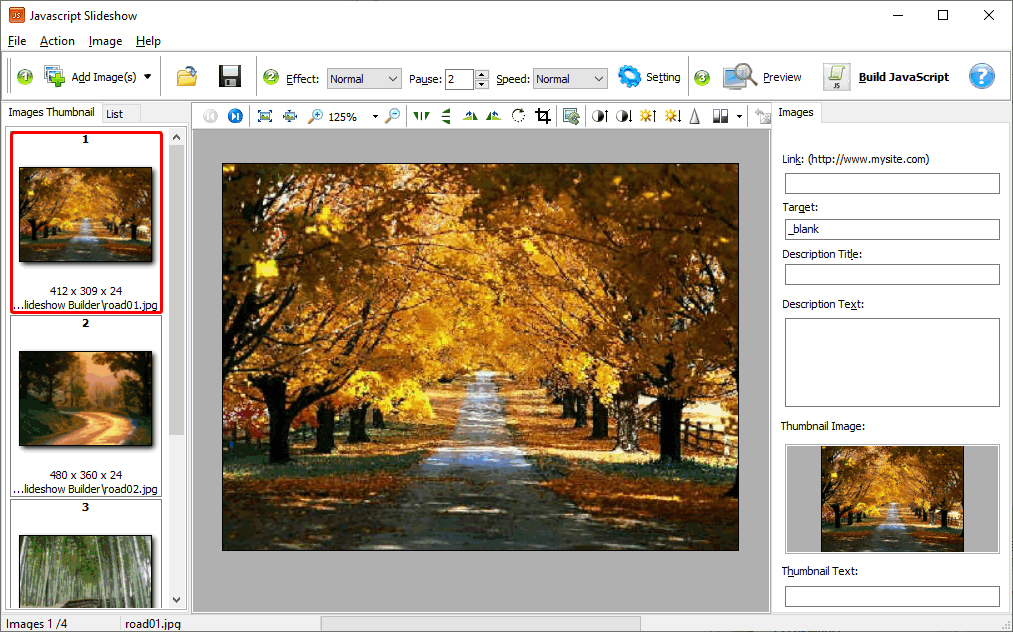 JavaScript Slideshow是一款简单且快速的幻灯片制作软件,这款软件拥有强大的幻灯片制作功能,可以帮助用户轻松创建网络幻灯片;这款软件易于使用,它拥有多种过渡效果,用户可以免费使用这些素材制作幻灯片;用户添加图片后只需单击几下就可以完成幻灯片的创建,整个过程不需要用户编写任何代码;使用JavaScript Slideshow创建的幻灯片可以在各种浏览器中打开,这表示用户不用安装特定的幻灯片预览器就可以直接在网页中打开并查看幻灯片的内容;需要的朋友赶紧下载吧。