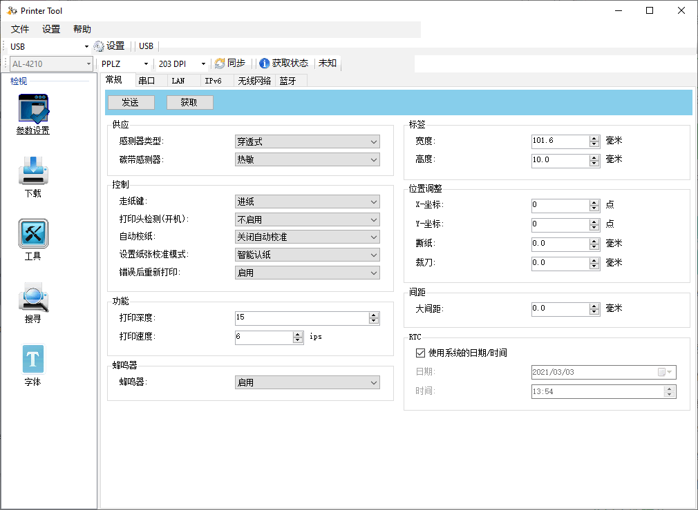 常用功能:重启打印机,重置为出厂设置,自检,更改打印机语言,纸张校准,碳带校准,间距,清理存储器。