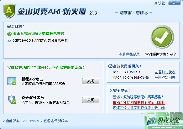 下载金山贝壳ARP防火墙2.0.4104.61(2009-12-17)