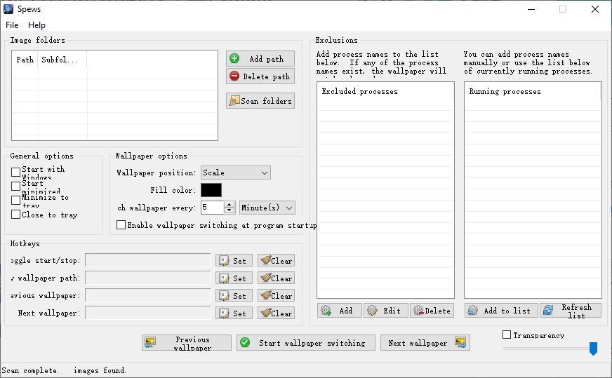 Spews是一款便捷实用的壁纸设置工具,旨在帮助用户将本地图片制作成壁纸,用户通过这款工具可以设置壁纸更换的时间;一张壁纸使用久了用户就会产生更换壁纸的想法,但大部分用户都不可能频繁更换壁纸,因为这确实很浪费时间;Spews是一款很好用的壁纸自动更换工具,这款工具易于使用,用户只需要将喜欢的壁纸添加到软件中,然后简单配置相关更换参数就能让壁纸自动更换;这款工具非常轻小,即开即用,对这款工具感兴趣的小伙伴欢迎下载使用。