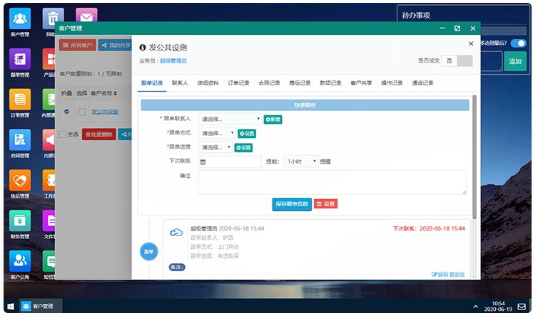 在该客户信息基础上,可以进行新增订单、合同记录、售后记录、款项记录等等