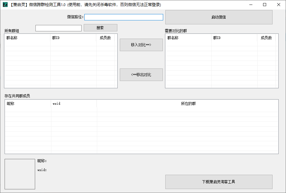 箫启灵微信跨群检测工具主要用于检测微信群中的重复好友;很多商家运营的微信群中会有很多重复群员,这些重复群员会占用微信群资源,毕竟微信群的成员数量是有一定限制而非无限添加的;还有一些同行也会悄悄潜伏在各种微信群中,如果不杜绝这样的现象很可能会给商家造成一些损失;箫启灵微信跨群检测工具的使用方式非常简单,直接通过该程序启动微信就可以获取微信群信息,然后再按用户需要将微信群添加到对比窗口即可获取对比结果,需要的朋友欢迎下载使用。