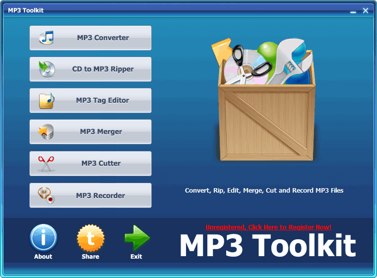 MP3 Toolkit是一款六合一的音频处理工具箱,该工具箱中包含了音频转换、CD翻录、音频信息编辑、音频合并/剪切和录音等工具;该工具箱的功能比较全面,一个软件就可以解决用户多种音频处理问题,是一个很不错的音频处理软件;一般而言,如果用户要录制音频、转换音频或进行其它音频处理操作时就需要分别下载对应软件,而现在使用这款MP3 Toolkit,您只需要安装一次就可以使用以上提到的所有功能;该软件绿色安全,无毒无广告,软件提供的所有工具都很简单,适合大部分用户使用。