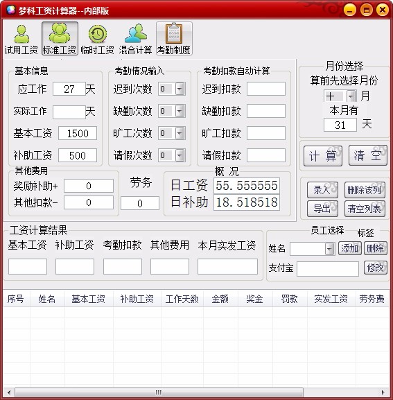 梦科工资计算器是一款非常简单且实用的工资计算软件,使用该软件可帮助用户快速将员工工资进行计算,为用户提供了一套完美的工资计算方案,您只需输入计算所需数据即可快速进行计算,支持计算试用工资、标准工资以及临时工资,从多方面满足您对工资计算的不同需求,有的时候需要计算很多员工的工资,若手动一个一个进行计算就会很麻烦,同时也容易出错,这时候就可以用到这款软件,还可根据考勤情况自动计算考勤扣款,使用起来非常方便,需要的话就赶快下载吧!