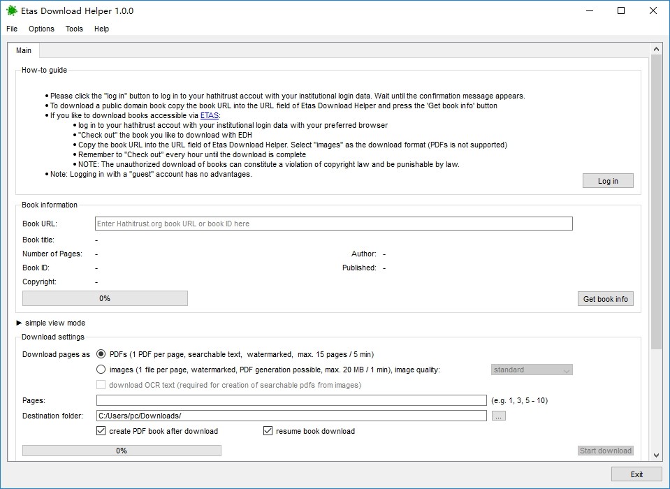 Etas Download Helper是一款简单专业、方便好用的书籍下载软件,使用这款软件用户可以用您的机构登录数据从hathitrust.org下载书籍,用户只需书籍下载地址即可进行数据下载,通过该软件用户可以将下载的书籍文件进行保存;Etas Download Helper这款软件可以下载图片、OCR文本以及PDF文档等文件,同时可以对下载的文件进行转换,通过该软件用户可以将图像转换为pdf书本、将图像转换为单个pdf文件以及转换为仅使用的纯文本,同时可以对文件水印进行消除等操作,非常方便实用。