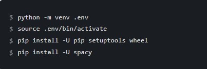 安装spaCy的另一种方法是克隆其 GitHub存储库并从源代码构建它。如果要更改代码库,这是常见的方法。您需要确保您拥有一个包含Python发行版(包括头文件,编译器,pip和git)的开发环境 。编译器部分最棘手。如何做到这一点取决于您的系统。有关详细信息,请参见Ubuntu,macOS / OS X和 Windows上的注释。