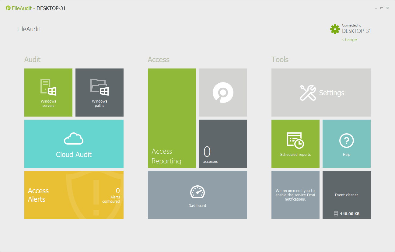 一旦FileAudit显示目标文件夹的审核配置结果,您就可以在此定义“单次访问”警报。您将在右侧找到名为“添加警报”的平铺。点击它。