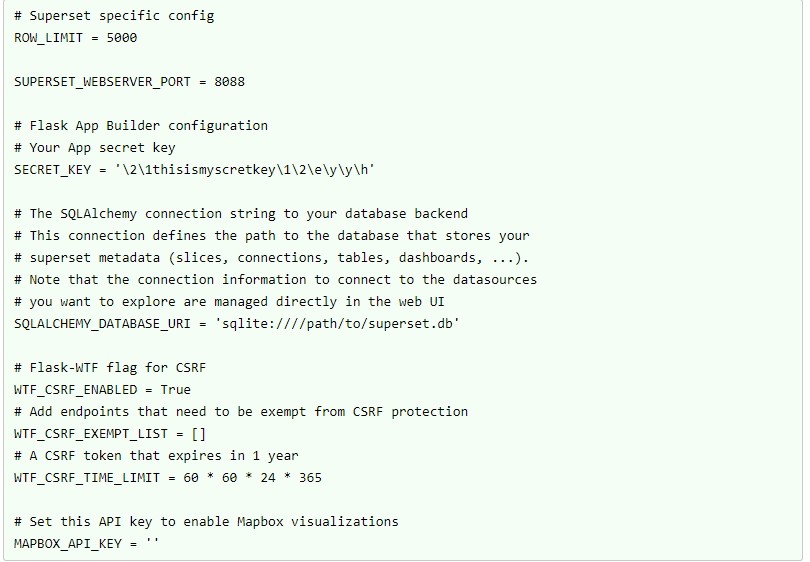 要配置您的应用程序,您需要创建一个文件superset_config.py并将其添加到中 PYTHONPATH。以下是您可以在该文件中设置的一些参数: