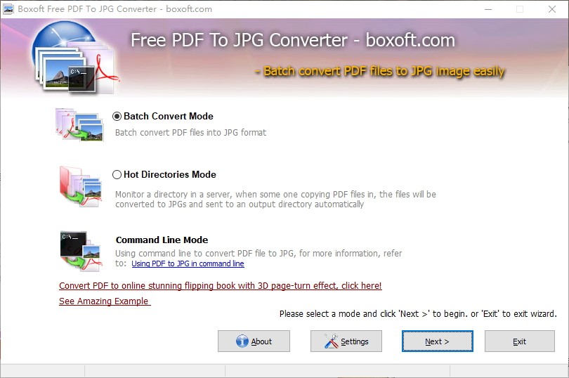 Boxoft PDF To JPG Converter是一款体积轻量、简单易用的专业PDF转换软件,该软件总体积不到2MB,但内置有丰富的图片转换模式,分布式批量转换模式、热目录模式以及命令行模式,通过此软件用户可以快速地将可移植的PDF文档转换成JPG格式的图像,除此之外用户可以转换为BMP、JPEG、PNG、TIFF等场景的图片格式;Boxoft PDF To JPG Converter界面简洁直观、操作简单便捷,使用这款软件用户可以对转换的图片进行自定义,可以对图片转换范围、输出名称、质量和颜色类型等参数进行编辑设置,十分方便实用。