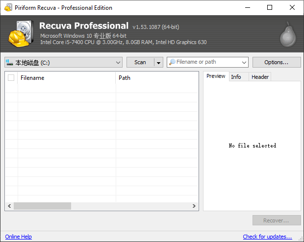 5、如果关闭Recuva的引导窗口就会跳转到这个窗口中,用户同样可以在这个界面中恢复数据。