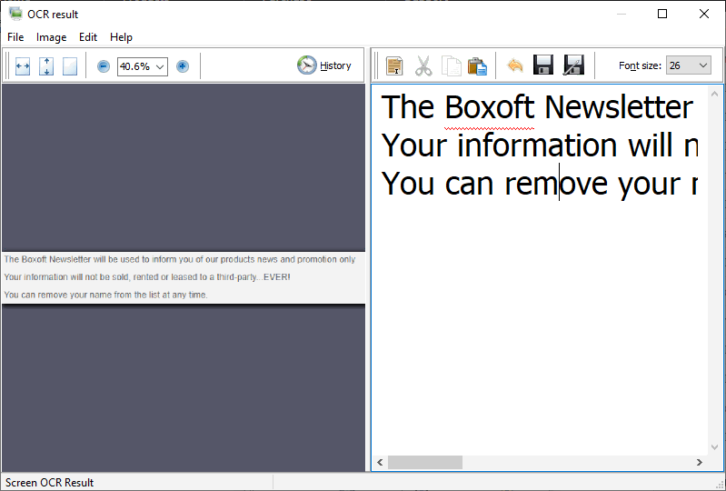 Boxoft屏幕OCR为您提供简单的文本编辑工具,例如“全选”,“剪切”,“复制”,“粘贴”等。编辑功能使您可以直接修改提取的文本内容,然后再另存为文本文件。