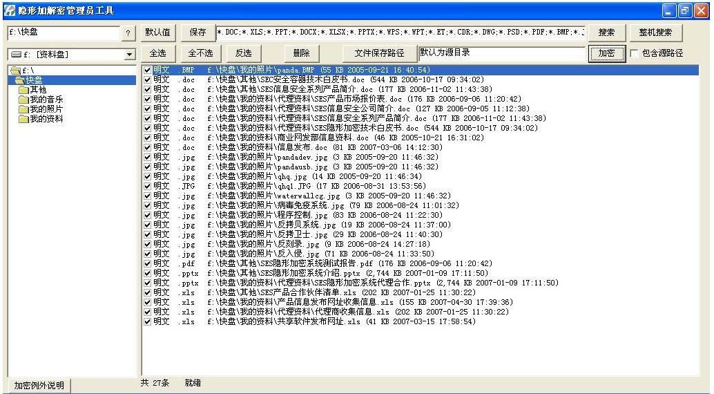 选择指定的分区或文件夹,设置检索文件扩展名,点按钮[保存]将设置好的检索文件扩展名的参数保存下来,以备下次打开时重用,点按钮[默认值]是把默认值替换输入框中的参数,默认值为:[*.DOC;*.XLS;*.PPT;*.DOCX;*.XLSX;*.PPTX;*.WPS;*.WPT;*.ET;*.CDR;*.DWG;*.PSD;*.PDF;*.BMP;*.JPG],可以任意删减。最后点搜索或整机搜索,将符合条件的文件列表出来,检索结果会显示加密状态为明文或密文、文件路径、文件大小和文件日期。