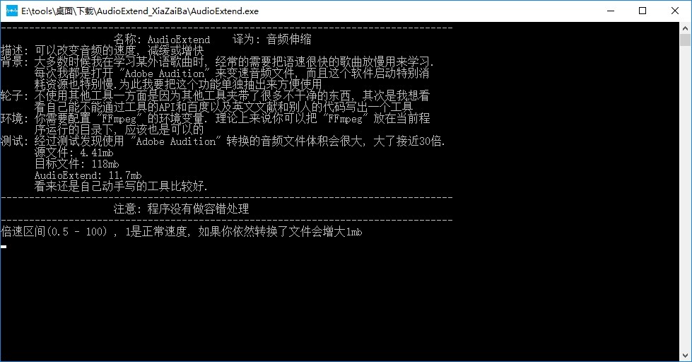 AudioExtend是一款功能强大、专业实用的音频变速软件,使用这款软件用户可以进行专业便捷的音频速度改变,用户可以通过该软件减缓或增快音频文件播放速率,同时AudioExtend这款软件封装了FFmpeg的命令行参数,用户可以直接通过命令行来控制音频变速,非常简单方便;AudioExtend可以在学习某外语歌曲时把语速很快的歌曲放慢,便于用户进行英语歌曲学习,且该软件体积轻量,启动速度快、消耗系统资源小,是一款非常不错的音频变速软件,有需要的用户可以下载使用。