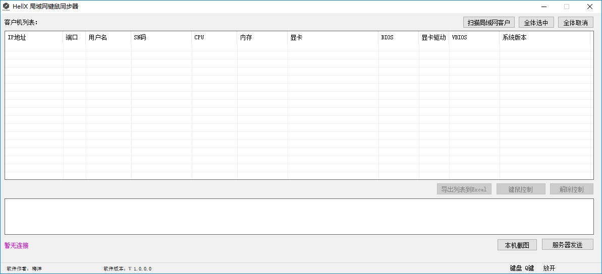 HellX局域网键鼠同步器是一款体积轻量、简单易用的键鼠同步软件,通过该软件用户可以在局域网内进行键鼠同步操作,有点类似于有局域网控制的效果,同时该软件的服务器及客户端集成在同一个软件内,因此可以实现文本一键发送以及键鼠同步控制;HellX局域网键鼠同步器界面简洁友好、操作简单方便,支持局域网客户机快速扫描,支持客户机数据一键导入Excel表,方便用户对客户机列表数据进行编辑处理,同时该软件还内置本机截图、服务器发送等功能,可以对当前屏幕进行截图保存以及文件发送分享,非常简单方便。
