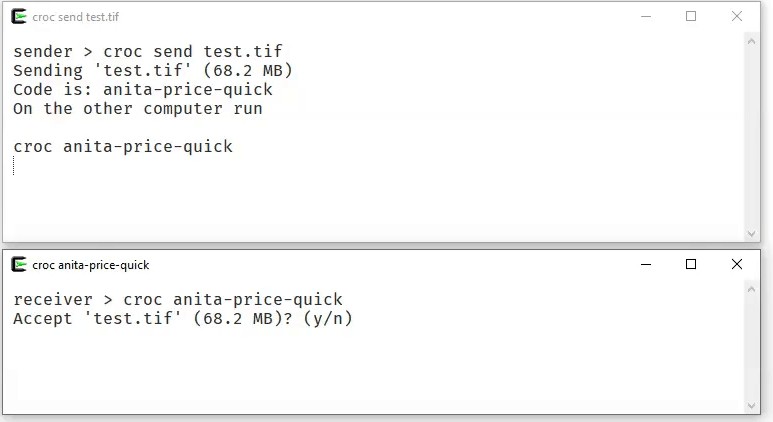 croc是一款采用golang 编写的文件安全传输软件,使用这款软件用户可以在两台计算机直接进行快速便捷的文件传输,该软件是通过系统控制台直接操作,内有复制的代码编译,可以快速直接的进行文件数据传输,且通过该软件传输的文件都具有极大的简安全保障,不会导致数据丢失或者损坏;croc 是目前唯一的 CLI 文件传输工具,是一款没有界面仅靠代码就能运行的文件传输软件,该软件体积小巧、占用系统空间不大,支持多平台传输,文件传输速度极快,且具有极好的安全性,非常方便好用。