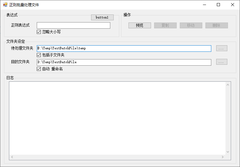 正则批量处理文件软件是一款高效的文件处理工具,可帮助用户批量移动文件,复制文件和删除文件;这款工具通过正则表达式处理文件,非常高效便捷;使用正则表达式可以提升用户处理文件的速度,平时需要几十分钟甚至几个小时才能完成的工作,现在只要几分钟就能完成;正则批量处理文件软件支持忽略大小写,这意味着用户无需按正式的书写方式来编辑正则表达式;这款工具简单易使用,用户仅需拥有简单的正则表达式编写能力即可操作;需要的朋友赶紧下载吧。