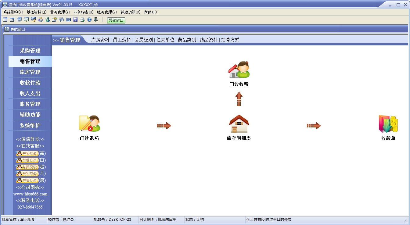 速拓门诊收费系统是一款功能强大、简单易用的医疗门诊收费管理系统,专门正对各类医疗门诊店铺而研发的收费管理软件,内置采购管理、销售管理、库房管理、收款付款、收入支出、账务管理、辅助功能、系统维护等八大功能操作模块,可帮助聊天门诊快速便捷的进行收费管理;速拓门诊收费系统功能丰富齐全、简单专业,可以轻松实现门诊智能订货采购、物品出库入库以及客户会员等信息管理,可以有效减轻门诊医师对门诊店铺的管理难度,从而有效提高门诊工作效率,非常方便实用,有需要的用户可以进行下载。