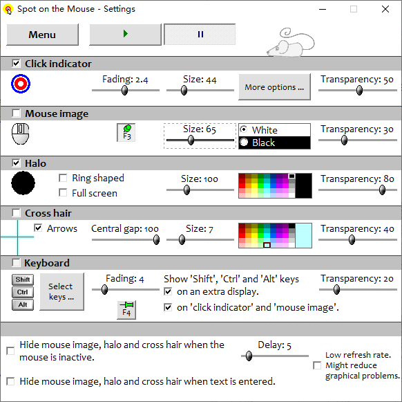 Spot On The Mouse是一款实用的鼠标增强工具,主要增强鼠标在显示方面的问题;鼠标的指针比较小,用户在个人电脑上使用鼠标不会有任何不方便的地方,但如果用户在进行演示时,坐在台下的观众就可能会看不到鼠标的移动轨迹,这在教学培训中是非常不友好的;Spot On The Mouse可以让鼠标拥有一个光环,用户可以自定义调节它的大小以及透明度,在增强鼠标显示的同时还不会对用户办公造成影响;这款工具为用户提供光环和十字辅助线,可用在多种办公环境中,需要的朋友欢迎在本站下载。