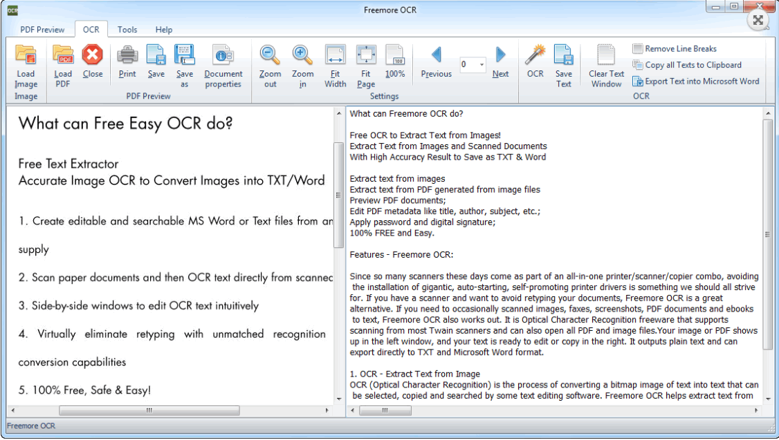 Freemore OCR设计有文本编辑器,可让您在不使用MS Word的情况下编辑OCR结果文本。在文本窗口中,允许您添加或更正文本。