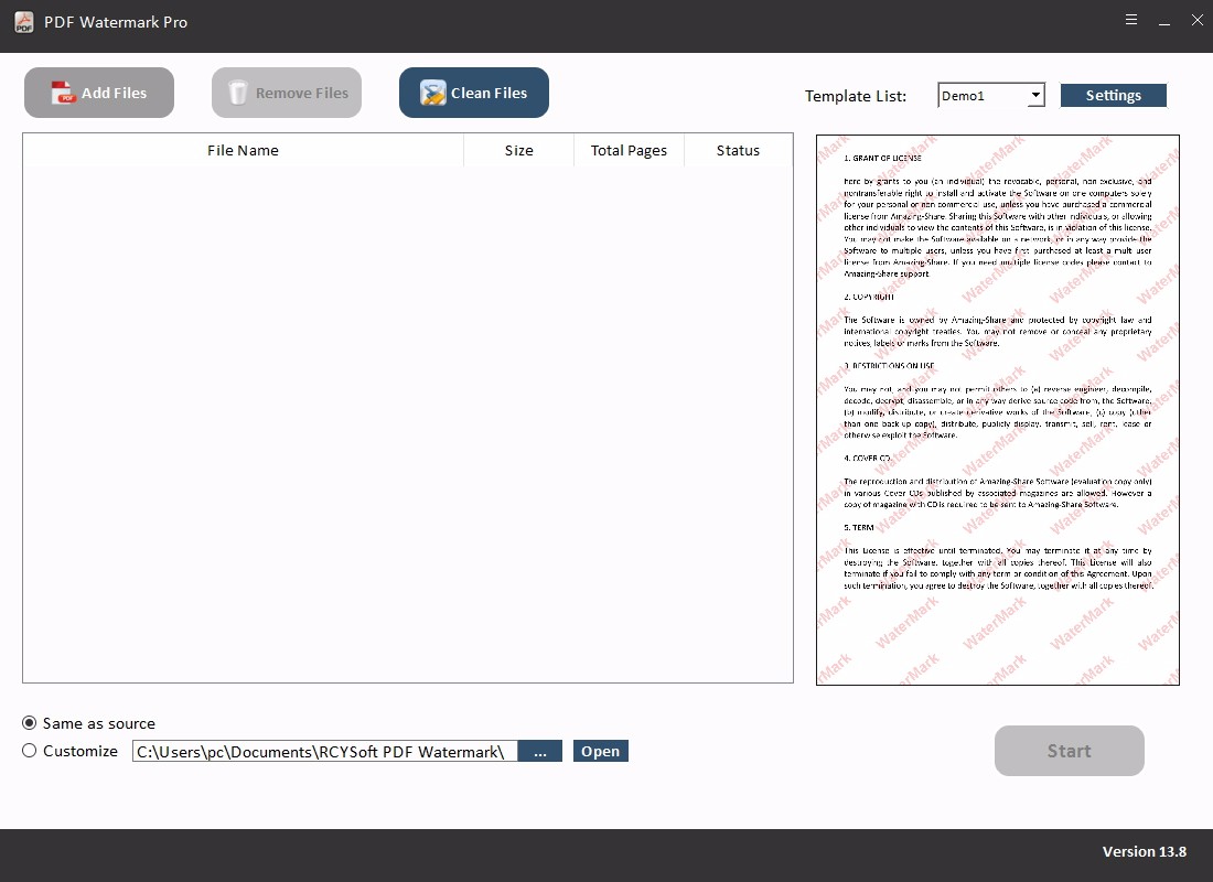 选择保存PDF文件的源,然后单击“开始”按钮以开始向PDF添加添加文本或图像水印。