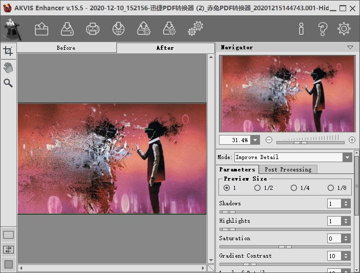 在改善详细模式下,程序通过强化颜色转换来显示图像的细节。它加强具有不同色阶的相邻像素之间的差异,并允许在阴影和高光中显示细节。