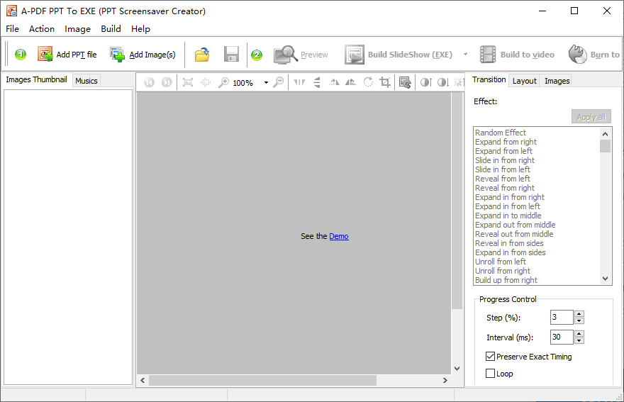 提供4种输出模式:Build SlideShow(EXE),Build SlideShow(SCR),Build to video(AVI,WMV,MPEG),Burn to CD;