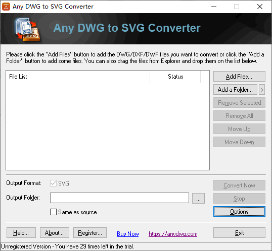 Any DWG to SVG Converter是一个轻量级的DWG文件转换器,可帮助用户将DWG、DXF和DWF等格式的文件转换成SVG;这款软件拥有简洁的用户界面,使用起来会非常直观方便;DWG、DXF和DWF都是CAD图像的文件格式,而SVG则是一种矢量图像,这种图像具有可缩放的特点;SVG一般应用在网页设计中,用户可以使用代码来描绘SVG图像,当然也可以将其它图像转换成SVG,比如这里介绍的这款工具就可以帮助用户将CAD图像转换成SVG图像;这款软件简单好用,需要的朋友赶紧下载吧。