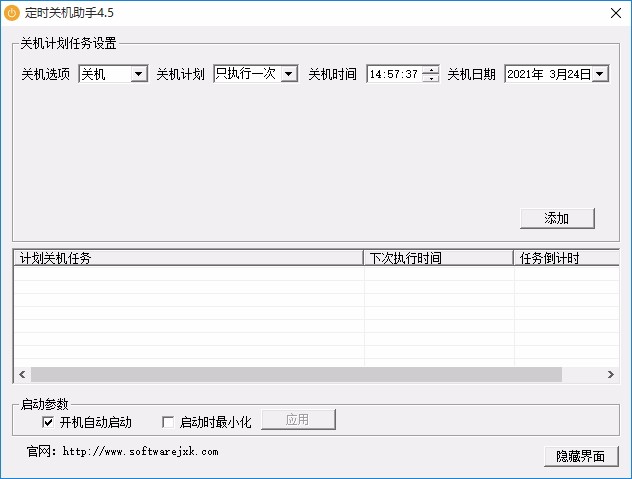 软军定时关机助手是一款非常简单且实用的定时关机软件,通过这款软件可帮助用户快速将电脑自动进行关机,有的时候我们可能要暂时离开电脑,但是又希望电脑继续执行下载任务或者其它任务,这时候就可以用到这款软件,您可以根据任务情况设置定时关机时间,在此期间电脑依然执行下载任务,当到达指定的时间时即任务下载完成后,即可自动将电脑关机,使用起来非常方便,不仅帮助您完成了下载任务而且还将电脑自动进行关机,这样一来您就再也不用担心忘记关电脑了,欢迎有需要的用户下载体验