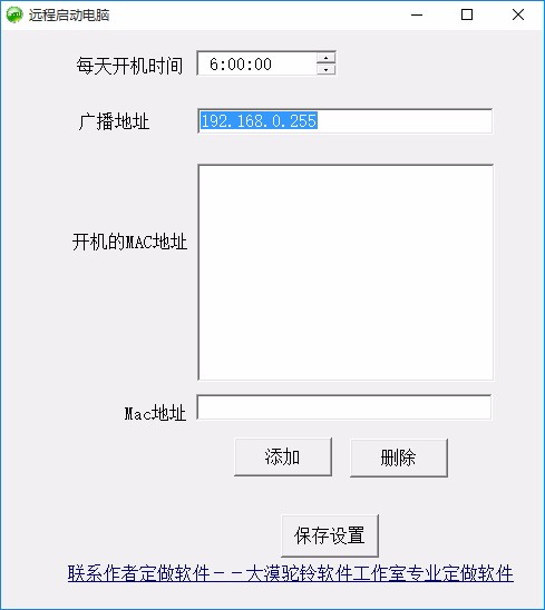 大漠驼铃远程开机工具是一款非常简单且实用的远程开机软件,该软件的主要功能就是帮助用户快速进行远程开机,有的时候我们可能需要对多台电脑进行管理,这时候就可以用到这款软件,通过该软件您可以远程启动在同一局域网内的所有电脑,您只需设置每天开机时间、广播地址以及开机的MAC地址即可,支持保存功能,可将当前的设置进行保存,便于后续快速远程启动电脑,无需再次进行设置,即使您不在电脑旁也能让其自动开机,使用起来非常方便,欢迎有需要的用户下载体验