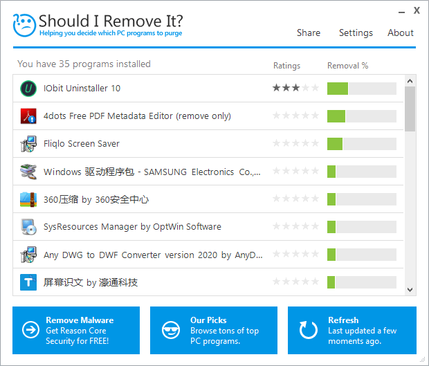 Should I Remove It是一款实用的软件卸载工具,可用于卸载电脑中无用的软件或垃圾软件,这款软件的使用方式与一般的卸载工具相似,不同的地方在于这款软件会帮助您查找恶意软件,包括系统中无法查看的广告软件;这款工具会对软件进行一个评分排名,您可以根据排名卸载软件;Should I Remove It非常易于使用,它还具备报警提示功能,当电脑上有恶意软件在安装时,软件会及时向您发送警报;总之这款工具非常实用,并且体积轻小不占内存,需要的朋友赶紧下载吧。