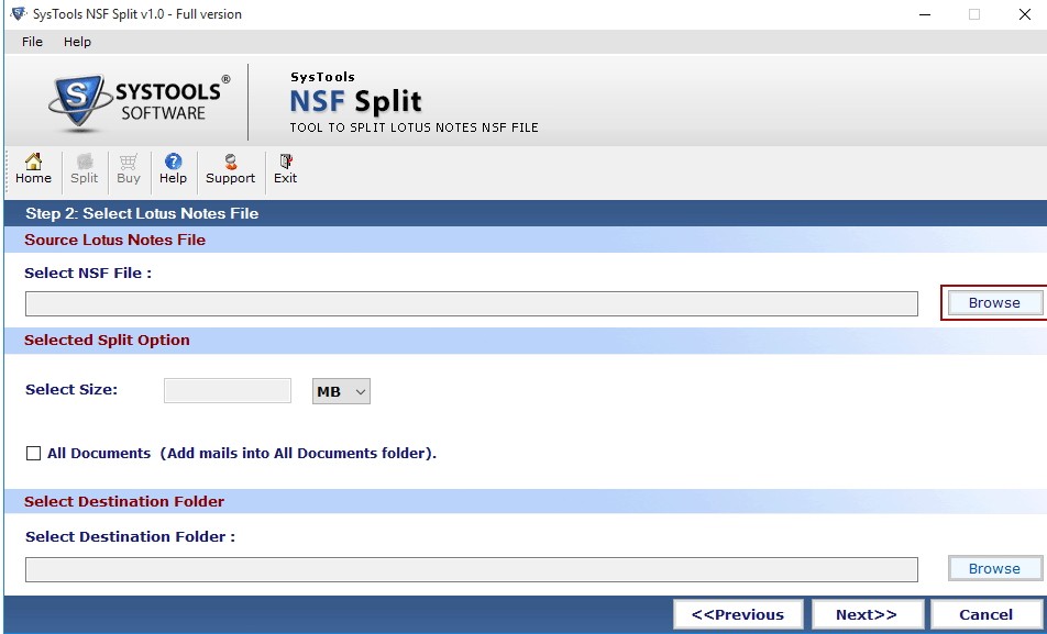 您可以使用Split NSF File Tool从繁重的Lotus Notes数据库归档中创建多个NSF文件。如果您需要根据大小拆分Lotus Notes存档文件,则只需选中“按大小拆分”选项并定义约束大小,以便创建相同大小的多个文件块。如果需要根据文件夹或年份拆分NSF文件,则选择相应的选项。