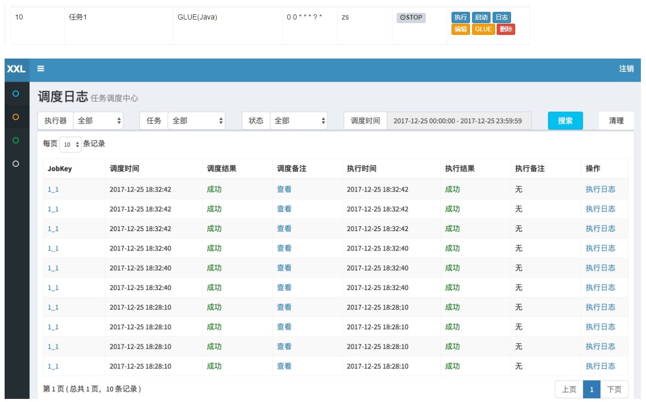 点击“日志”按钮,可以查看任务历史调度日志。在历史调入日志界面可查看每次任务调度的调度结果、执行结果等,点击“执行日志”按钮可查看执行器完整日志。
