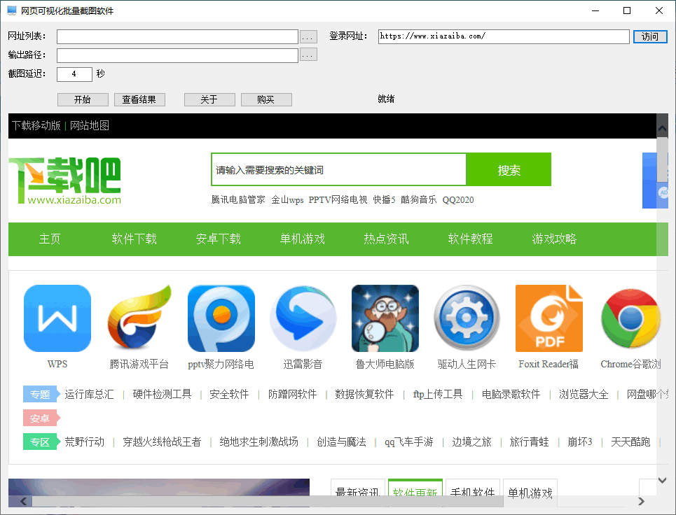 网页可视化批量截图软件是一个高效的网页截图软件,它可以帮助用户批量截取网页图像,并将截取的图像保存到指定的路径中;一般情况下,采用手动方式来截取网页图像会比较麻烦并且截图效率也很低,因为用户每截取一次图像就要手动打开一个网页,而如果用户使用这款网页可视化批量截图软件来截取网页图像的话,用户只需简单的配置就能让软件自动完成网页截图,这款软件还允许用户设置截图的间隔时间,这样软件会每隔一段时间截取一次图片;这款工具能够为用户节省不少时间,需要的朋友赶紧下载吧。