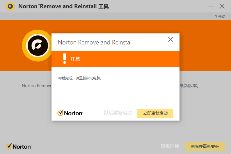 4、之后会自动卸载计算机中的Norton软件,按提示重新启动计算机即可。